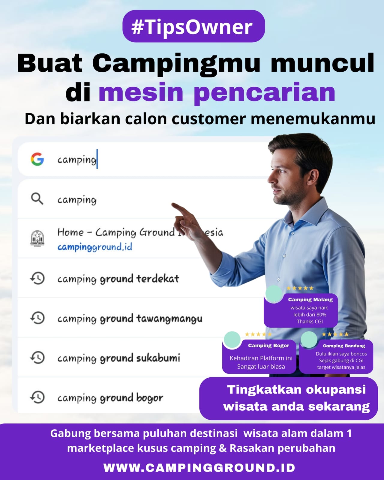 Persaingan bisnis wisata semakin ketat. Jika camping ground Anda tidak mudah ditemukan di Google, maka wisatawan bisa beralih ke destinasi lain. Solusinya, Anda perlu strategi digital yang tepat agar nama camping ground Anda muncul di halaman pertama Google.